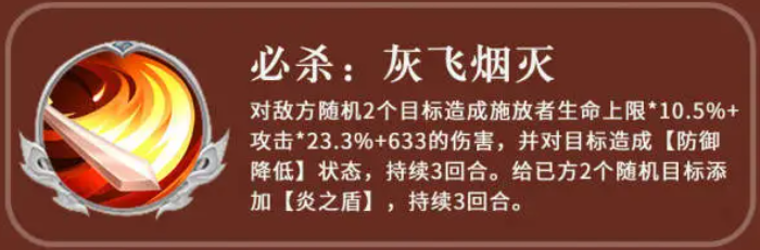 其必杀技名为灰飞烟灭,可对两名随机敌方单位造成伤害,伤害值包含自身生命上限的10.5%加成。释放大招时,还会附加23%的伤害比例以及633点固定数值伤害,并使目标陷入防御降低状态,该减益效果可持续3回合。与此同时,该技能还能为两名随机己方单位施加“炎之盾”,提升其防御能力,增益效果同样持续3回合。这种攻防兼备的设计,使得周瑜在团战中既能削弱对手,又能强化队友。