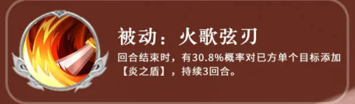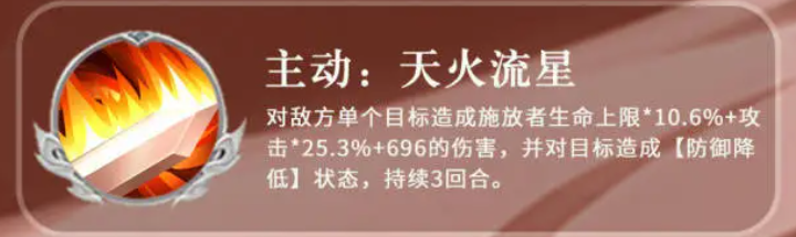 在被动技能方面,火歌弦刃可在周瑜每次行动结束时触发,约有30%概率为一名队友附加一层“炎之盾”。由于护盾效果可叠加,配合其他技能能显著增强队伍的抗打击能力,且持续时间与其他技能一致,均为3回合。主动技能天火流星则针对单体敌人,造成基于自身生命上限10%与攻击力25%的复合伤害,并额外附加696点基础伤害。此技能在打出高额输出的同时,也会使目标进入防御下降状态。