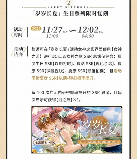 ※「四季如夏」生日思绪复刻女神之影包含第二次及后续复刻的夏彦生日思绪