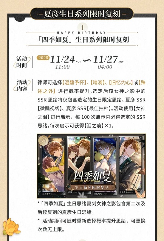 律师可选择【温馥予怀】、【暗漪】、【旧忆灼心】或【殊途之外】进行概率提升。选定后该女神之影中的SSR思绪将仅包含选定的生日限定思绪、夏彦SSR【微醺视线】、夏彦SSR【最佳拍档】。活动使用【女神之泪】进行启示,每100 次启示内必得选定的SSR思绪,每次启示可获得【泪之痕】×1