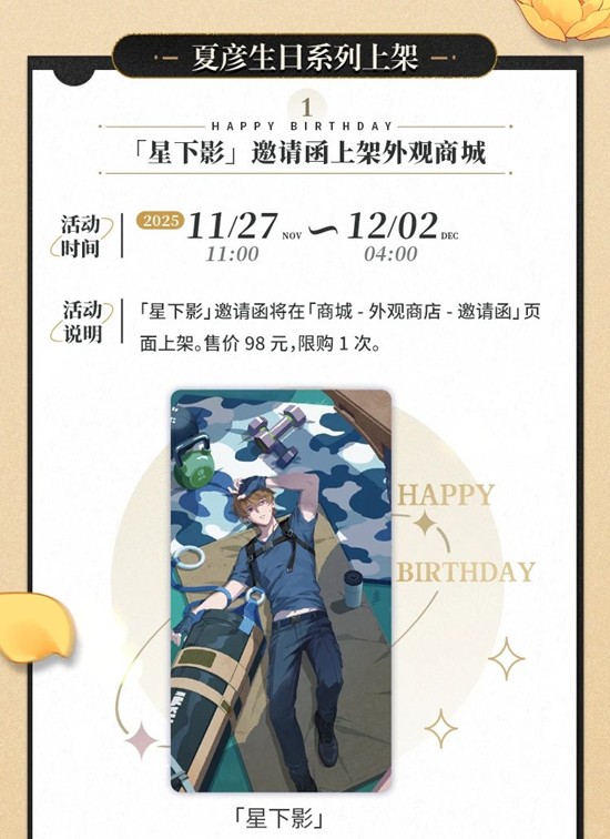 2025年11月27日11:00-12月2日04:00,「星下影」邀请函将在「商城-外观商店-邀请函」页面上架,开放购买