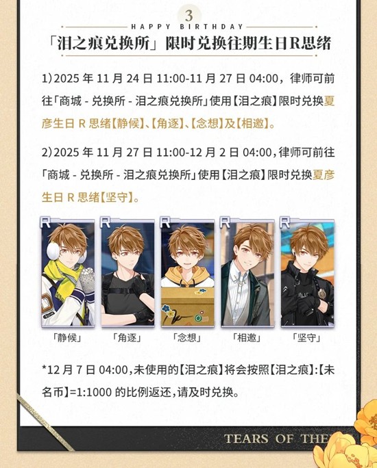 -2025年11月24日11:00-11月27日04:00,律师可前往「商城-兑换所-泪之痕兑换所」使用【泪之痕】限时兑换夏彦生日R思绪【静候】、【角逐】、【念想】及【相邀】