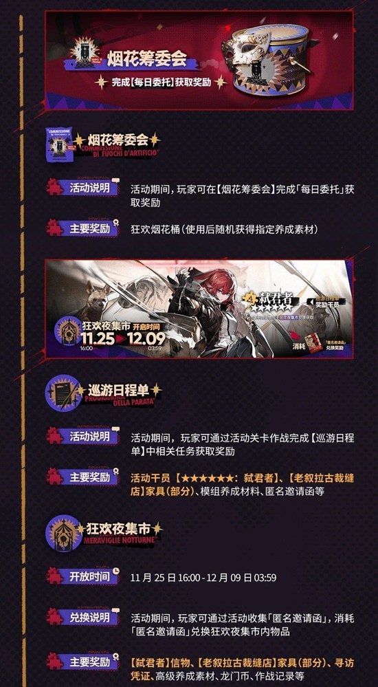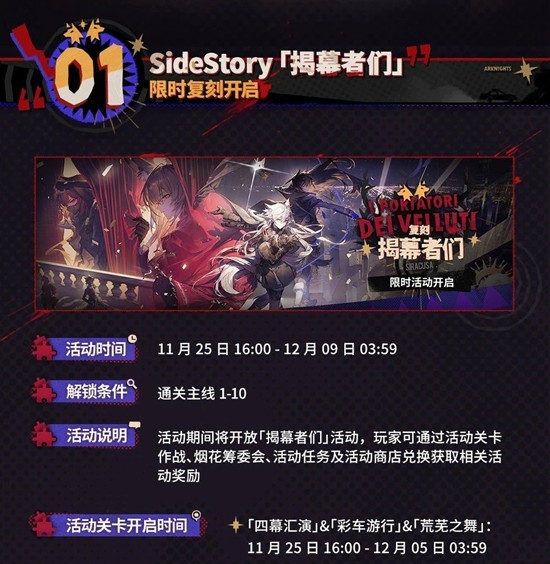 活动期间将开放「揭幕者们」活动,玩家可通过活动关卡作战、烟花筹委会、活动任务及活动商店兑换获取相关活动奖励