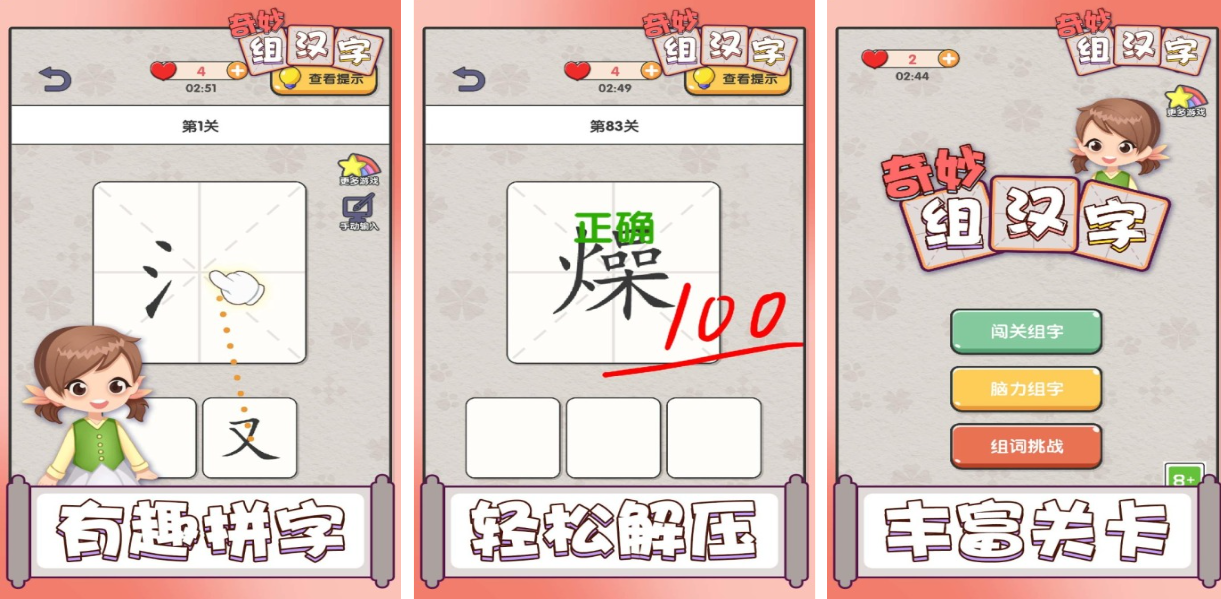 这款小巧的解谜游戏包含拼音标注、汉字拆分等基础教学功能,谜题种类丰富,需按任务要求逐一破解。每通过一关即可获得赏金金币,可用于后续解锁提示道具,提升通关成功率。多样的汉字主题玩法营造出轻松愉快的游戏节奏,让玩家在游戏中感知汉字的千变万化。