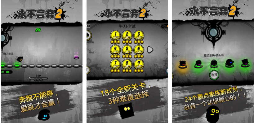 该作延续了前作创新的音乐跑酷概念,玩家需操控一个小墨点跟随节拍跳跃前进。每一次落地都会触发精准的音符声响,形成完整的旋律线。游戏融合节奏感知与反应力挑战,设有多个高难度关卡,考验玩家的手眼协调能力。多样化的皮肤系统也为视觉体验增添趣味,整体玩法紧凑而富有成就感。