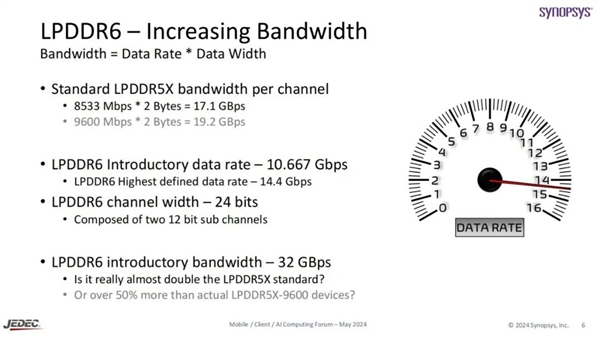 相较最初的 LPDDR5(6400MT/s),单颗 LPDDR6 理论带宽提升大约是 2.5–3.4 倍;对比目前速率最高的 LPDDR5X(10667MT/s),也有大约 1.5–2 倍的提升。
