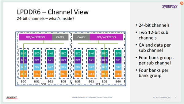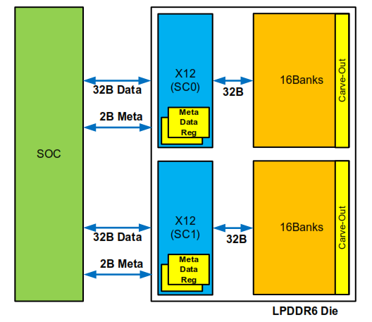 每个 LPDDR6 芯片包含两个子通道,单个子通道的位宽为 12?bit,而 LPDDR5 仅仅是 16bit 单通道的设计。