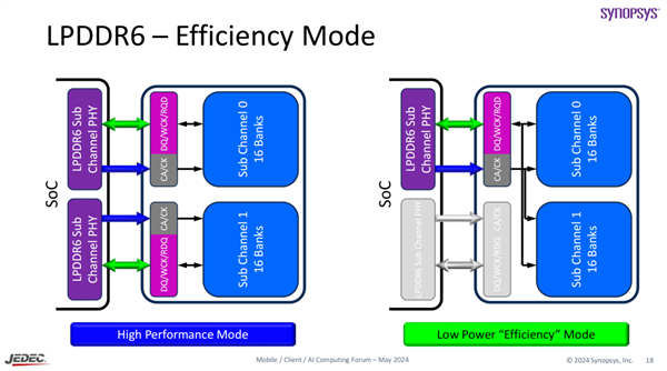 这就使得 LPDDR6 内存能够支持三种数据传输模式的切换,做到带宽的 “按需分配”: