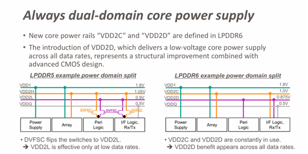说人话就是,LPDDR?6 强制规定,将常规供电(VDD2C)与低功耗供电(VDD2D)分成了两条电源轨。在内存工作的高频段,使用稍高的电压保证性能,在空闲时切换到更低的电压,降低功耗。