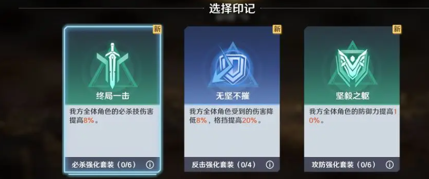 每场胜利结束后,系统会提供三种印记供玩家择一获取。例如可使全队防御提升10%的“坚毅之躯”,或增强全员必杀技伤害8%的“终局一杀”。这些增益仅在当前副本生效,但能显著强化队伍战斗力,助力玩家应对更高难度的挑战。