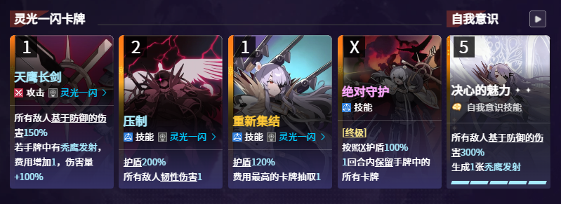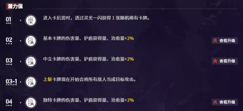 此外词条方面,这个推荐的是防御固定值大于暴击率大于防御百分比大于爆伤,最后才是攻击力量主要的,所有输出牌及护盾量主要吃的都是防御力,攻击力的收益比较低,所以不太推荐为了追求吃满最后一条潜能而堆700点攻击力,这里更推荐删除卡牌,首先是按边打,其次是基础盾,如果和卡利佩搭配的队友有较多两岁以上的卡牌,则上闪也可以一并删除,如果两费牌没有或很少,则可以留着卡利佩的灵光一闪,大家的核心追求就是脆弱偏少这两个关键词条,也就是说灵光一闪有脆弱选脆弱,有天上选天上,重新集结的话小编个人比较推荐在这两个中进行选择,首先第1个是天上词条和两费卡比较多的角色,如小春,凯龙,搭配时基本上可以实现不用额外花费用就可以压缩牌库加定向过牌。