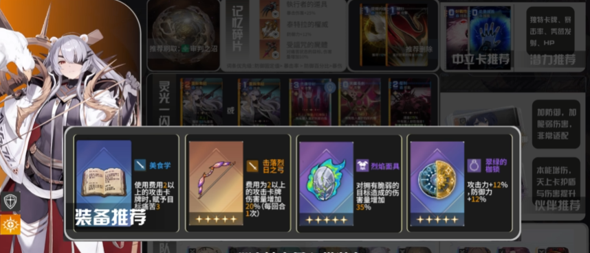 第2个则是可以稳定选用秃鹫发射,同样非常实用,秃鹫发射是卡利佩的核心卡,推荐在不爆档的情况下尽可能的复制,并且非常推荐脆弱2词条的黑鹰长剑,并且如果运气好,刷到了神一可以闪减一费,卡利佩在一回合内就可以造成不俗的群体伤害,最后压制这张牌也是一样,有脆弱选脆弱即可,再来看看卡利佩的装备推荐,第一个是蓝色装备美食学,如果准备给卡伊佩戴诅咒套,这基本是必带装备,因为是蓝色品质,且不限地点产出,相对来说还是很好刷的,有了她就可以给敌方稳定挂痛苦,并吃到诅咒套增伤,虽然痛苦打伤害是靠攻击力,但卡利佩主要是吃诅咒套的,10%增伤并非靠痛苦效果来打伤害。