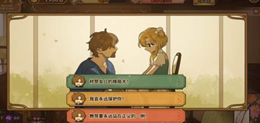夏火年期间,玩家会遇到女儿在2月、4月、6月、8月、10月的心事。夏火年二月的“三位领主关系”事件中,选择“我会永远保护你!”可以提升女儿的情感和魅力值,也可以提升爸爸的可爱、爱我评分;选择“讲述三位领主之间的制衡之道”可以提升女儿的智力、头脑值,也可以提升爸爸的睿智评分。每个选项的加成不一样,玩家要按照女儿成长的需求来合理分配行动点。