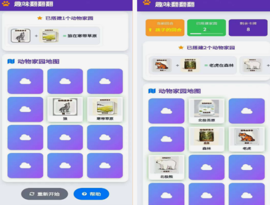 这是一款结合记忆与策略的卡牌翻转游戏,核心目标是为不同动物构建适宜的生活环境。例如当翻到北极熊时,需在地图中找到对应的寒冷区域进行匹配。玩家需要依次翻开卡片,正确配对动物与其栖息地,成功搭建越多动物园,获得的奖励也越丰厚。玩法轻松但富有逻辑性,非常适合喜欢动脑又想放松心情的用户。