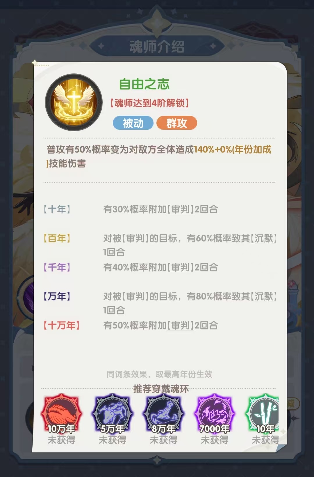 第2个被动自由之志,普攻时有几率变为对敌方全体造成伤害,有几率附加审判,对被审判的目标攻击时有机率使其沉默。对方被沉默之后就无法使用技能,也是一种很好的限制。最后一个被动天使真身,战斗开始前直接为自身和另外两个随机单位附加护盾,还能额外永久提升自身的伤害减免属性以及队友的伤害减免属性。当达到10万年魂环时,单单是被动提升的伤害减免就已经非常出色,所以说千仞雪事实上并不是单纯的防御型魂师,它具有很强的生存能力,但是输出方面的实力更强。