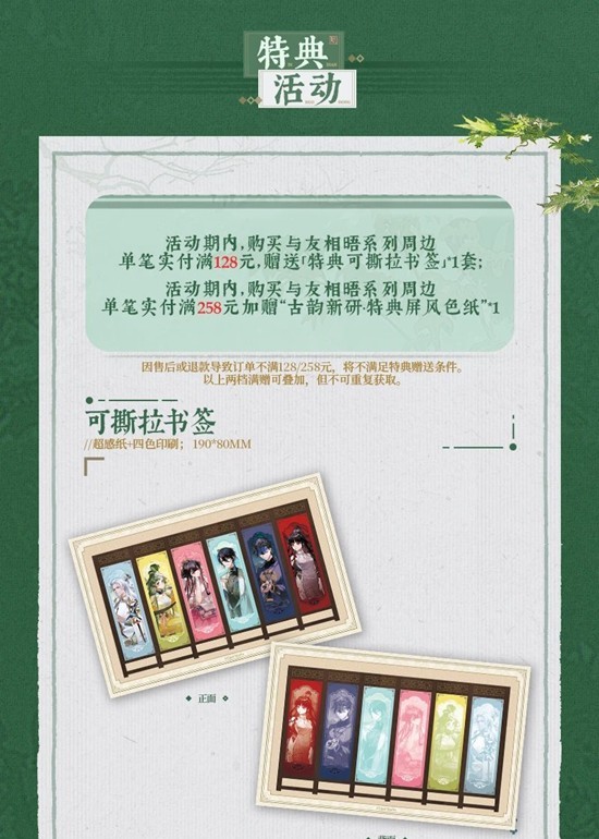 ③. 预售期间购买“与友相晤”系列产品,单笔实付满128元,赠送“特典可撕拉书签”*1;单笔实付满258元,加赠“特典屏风色纸”*1。