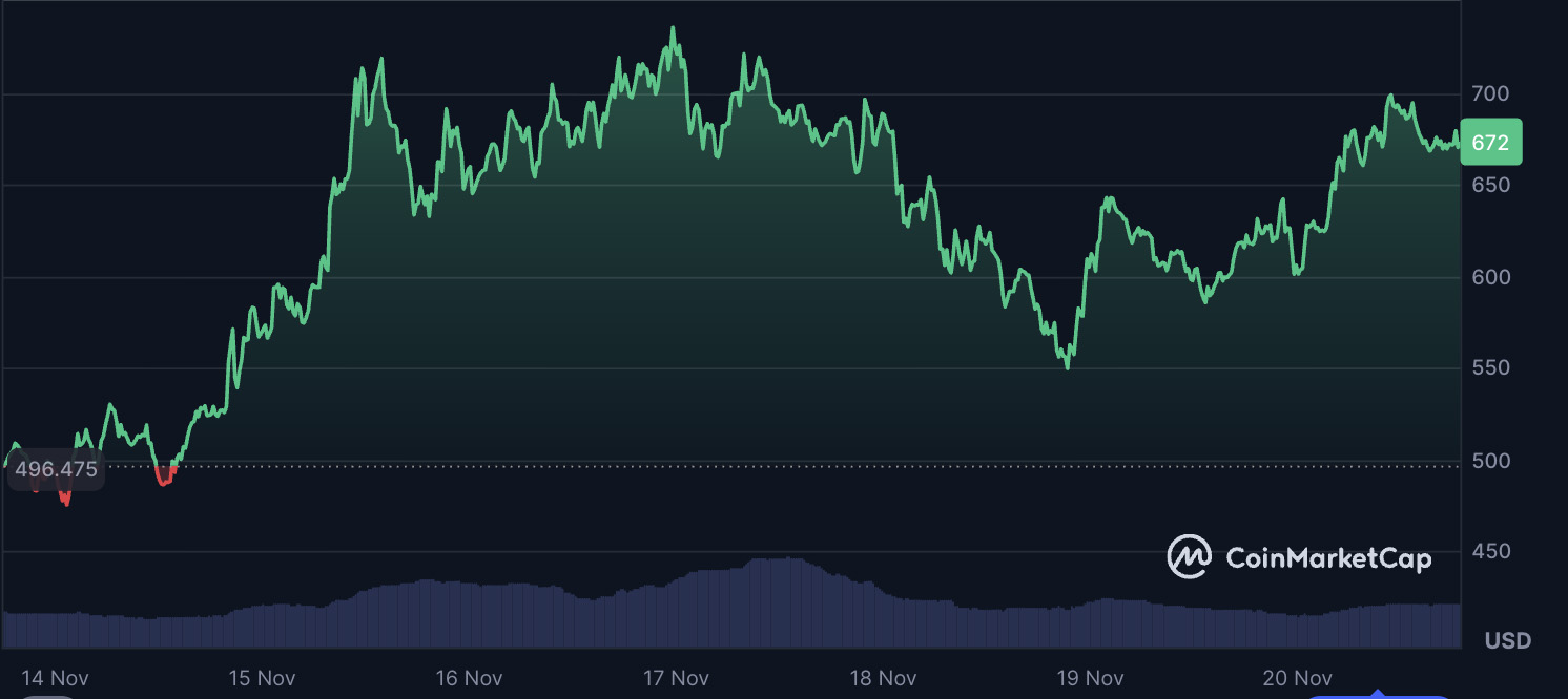 时间:2025-11-26 | 作者: | 阅读:0Zcash (ZEC)已成为 2025 年最具爆发力的加密货币之一,逆势上涨,在整体市场低迷的情况下,实现了出乎大多数人意料的垂直飙升。过去一周,ZEC 价格上涨超过 35%,一度接近 750 美元,目前稳定在 675 美元左右。今年迄今为止,ZEC 的涨幅已超过 1000%,从默默无闻一跃成为市值排名前 15 的加密货币。与此同时,比特币(本周下跌约 2%)和以太坊等主流加密货币走势停滞,更凸显了 Zcash 的强劲势头。