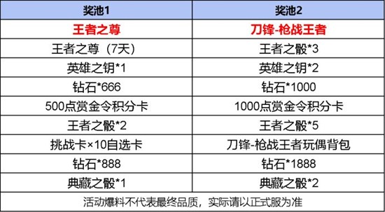 活动共设置两个独立奖池,王者之尊与刀锋-枪战王者分别是两个独立奖池中的大奖。CFer们需要通过完成任务来获取至尊轮回币,使用至尊轮回币抽取奖励。每个奖池中都有9个道具,抽一少一。