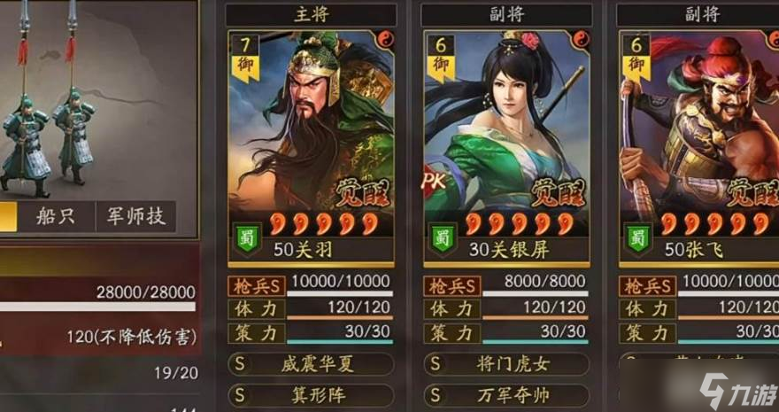 网红枪的弱点是五十满科技之后,dps会有所疲软。第三种队伍是群弓,它在定军山中常常作为碰瓷队来用。里面的角色对红度要求不高,因为它完全靠控制来碰瓷。就算手中没有SP朱俊,用紫色也能打出出色的成就。定军山有好用旗阵的情况下,碰瓷会变得更加丝滑。第四种队伍是关关张,其中关羽的标配是威震、威谋以及箕形阵。关银屏需要带上盛气、青州兵以及将门虎女等等, 至于张飞可以带上燕人、横扫以及据水。关关张的战法搭配不是固定的,仅需有盛气、横扫以及箕形阵就行。