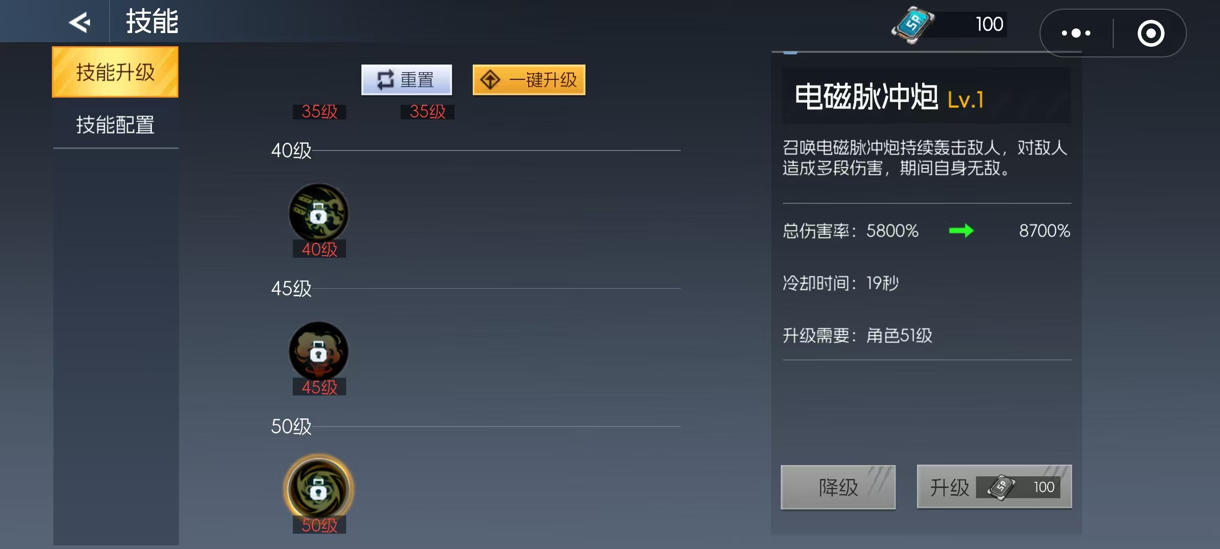 第5个怒焰地狱,40级的伤害技能,持续发射出怒焰,对前方敌人造成高额持续伤害,并使目标受到灼烧,持续6秒钟。第6个星轨冲击,45级破盾技能,呼叫出空间轨道攻击地面,向目标区域投放导弹造成大量伤害,该技能前摇有霸体时间,起飞后有较长的无敌帧。第7个技能电磁脉冲炮,50级终极技能,召唤出电磁脉冲炮持续轰击敌人,造成多段伤害,在此期间自身是无敌的。这些技能就是大家需要重点去加点的类型,从低级到高级都有涵盖,只要重点加这些技能,后续的连招就非常方便。