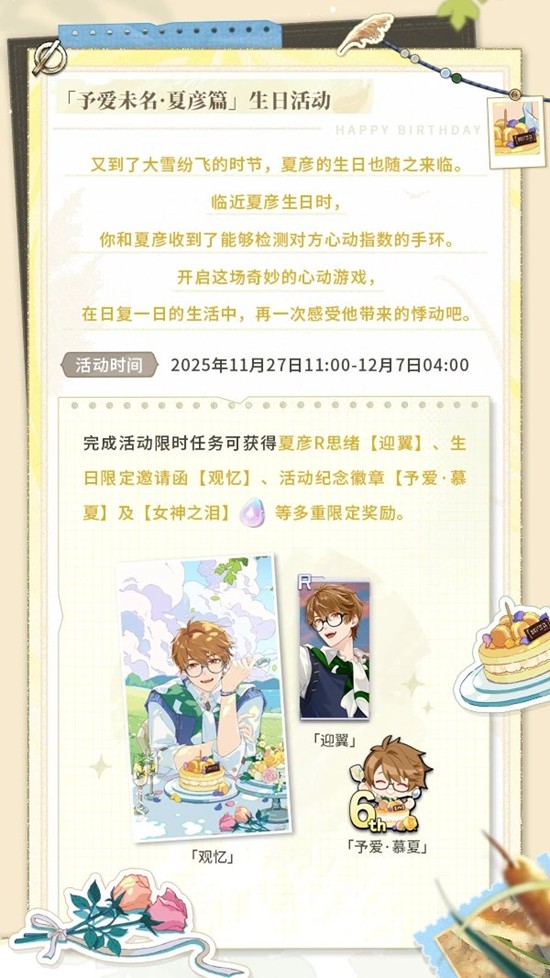 活动期间,完成活动限时任务可获得夏彦R思绪【迎翼】、生日限定邀请函【观忆】、活动纪念徽章【予爱·慕夏】及【女神之泪】等多重限定奖励