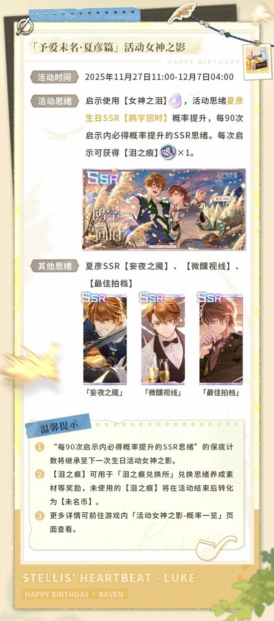 -活动思绪:夏彦生日SSR【鸥字回时】概率提升,每90次启示内必得概率提升的SSR思绪