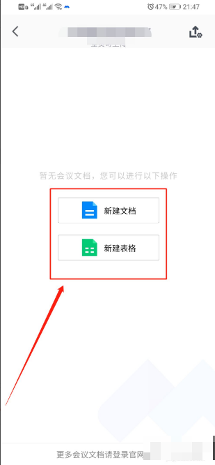 点击页面下方的【更多】-【会议文档】-【新建文档】和【新建表格】,可上传会议文件。