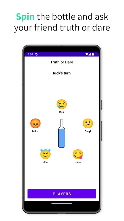 《真心话大冒险 Truth or Dare》还原经典瓶身旋转机制,指向谁即由谁作答,保留传统玩法的同时加入现代化功能。支持中英文切换,满足不同语言用户需求;内置计时器提升紧张感,未在规定时间内作答将触发惩罚机制。此外,提供跳过选项,尊重个人边界,兼顾游戏节奏与用户体验。