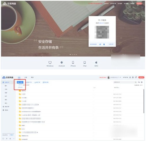 点开百度网盘的网页,有百度账户的可以直接登录,没有的就注册一个。首先点击“上传”键,自动出现“文件”和“文件夹”的选项,按需进行选择。