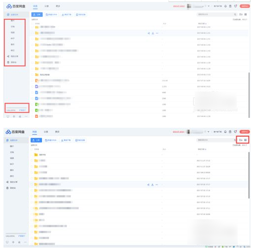 页面的左侧是上传文件的分类,方便用户快速查找需要的内容,左下方是容量的扩充键,如果上传保存的文件资料比较多,就要注意扩大容量了。右上角的选项可以调节列表中文件的排列顺序和显示方式。