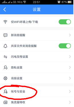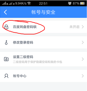在设置里面有一个账号与安全,点击进入账号与安全,之后我们可以在里面看到一个百度网盘密码锁。