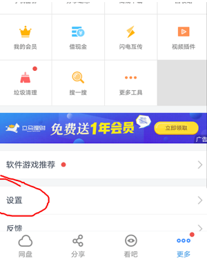 在更多中我们可以看到我们可以使用的容量大小,往下拉我们可以看到“设置”,点击进入设置。