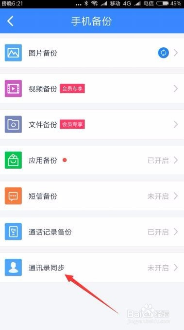 这时就会打开手机备份的设置页面,点击“通讯录同步”菜单项。