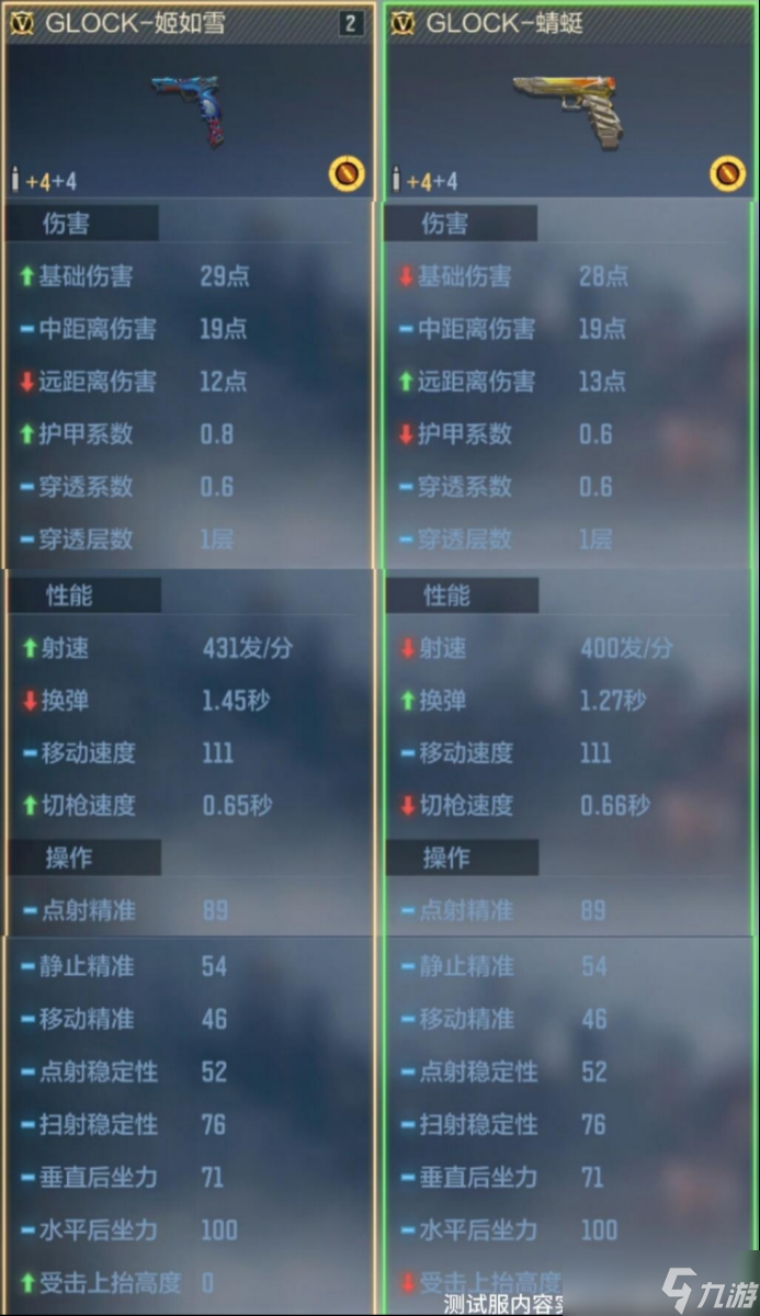 我们将GLOCK-姬如雪与GLOCK-蜻蜓进行对比。伤害上,其基础伤害29点高于蜻蜓的28点,护甲系数0.8也优于蜻蜓的0.6,中近距离对甲目标伤害更足;射速上,GLOCK-姬如雪431发/分远超GLOCK-蜻蜓的400发/分,切枪速度0.65秒略快于GLOCK-蜻蜓的0.66秒。只在远距离伤害和换弹时间上略逊GLOCK-蜻蜓,但这两项因素对手枪而言影响不大。