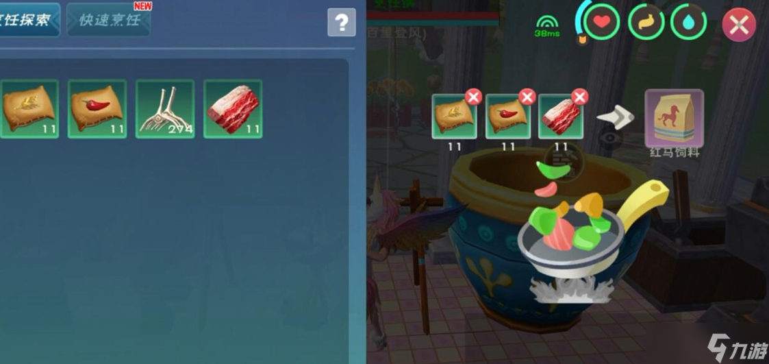 驯服的核心道具是特制饲料红马饲料,配方由饲料小麦+饲料胡萝卜+辣椒饲料包构成。制作时需通过工具台的道具分类合成饲料包(小麦饲料包消耗5个小麦,辣椒饲料包消耗5个辣椒),再将生成的饲料包与通过击杀熊、狼等生物获取的优质饲喂肉共同放入烹饪锅加工。建议储备至少11包饲料以确保驯服过程的稳定性。若缺乏辣椒资源,可通过玩家间交易获取。