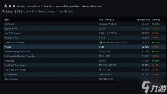 尽管V社宣称Steam主机性能是热门设备Steam Deck的六倍,但工程师Yazan Aldehayyat在Adam Savage's Tested频采访中透露,2026年问世的这款设备至少与70%Steam用户的平均配置持平甚至更优。其设计标准源自Steam月度硬件调查数据——根据2025年10月统计,最主流配置为Windows 11系统、六核Intel处理器配RTX 3060 8GB显卡、16GB DDR4内存及1-2个1080P显示器。