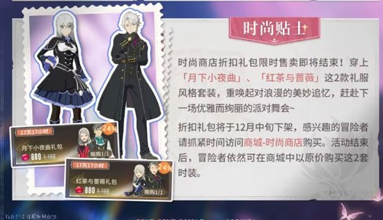 时尚商店的折扣礼包限时售卖即将结束,玩家们有机会以优惠价格获得「月下小夜曲」和「红茶与蔷薇」两款礼服装套装。这些套装不仅外观优雅,还能在游戏中为玩家带来独特的体验。