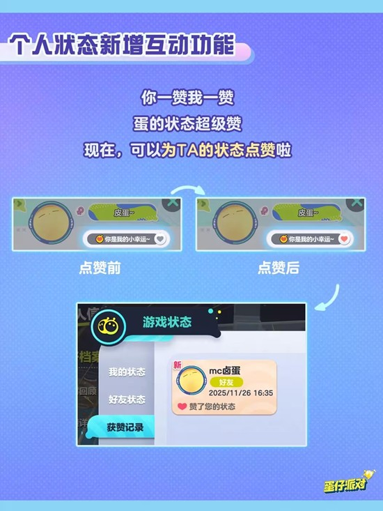 个人状态新增了点赞功能,玩家们可以为好友的状态点赞,增加游戏内的社交互动。无论是表达支持还是分享喜悦,这个新功能都能够让玩家们的友谊更加紧密。