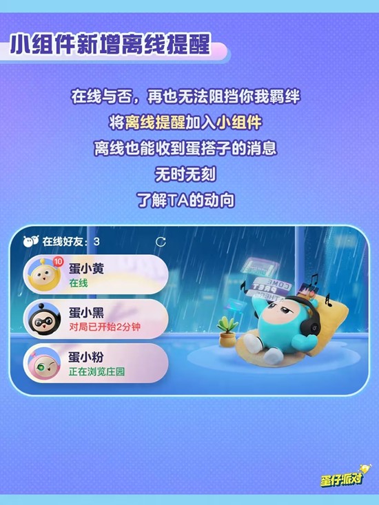 全新的小组件功能让玩家们即使在离线状态下也能收到蛋搭子的消息,无时不刻了解TA的动向。这个功能将帮助玩家们更好地保持联系,不错过任何重要信息。