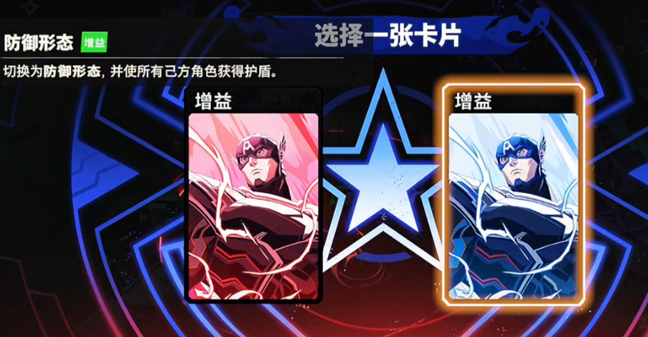 美国队长通常被部署在前排防御位置,具备出色的生存能力和抗打击属性。其标志性的盾牌不仅是外观特征,也在技能设计上起到了关键作用。战斗开始时,他可立即进入专属攻击形态,获得技能释放的额外增益。更重要的是,他可以在进攻形态与防御形态之间自由切换:处于进攻状态时,技能将提升自身攻击力;切换至防御状态后,则会增强自身的防御力数值。