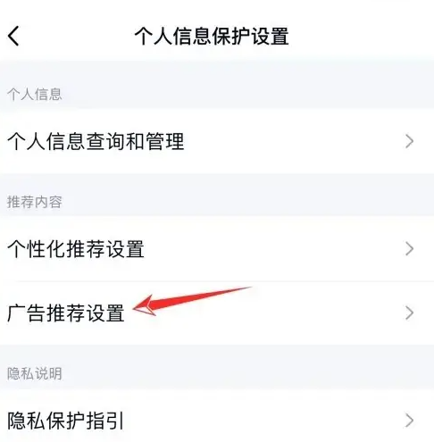 在个人信息保护设置的页面里,找到推荐内容里的广告推荐设置。