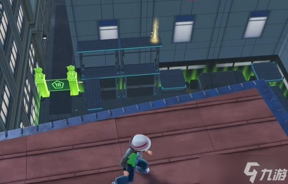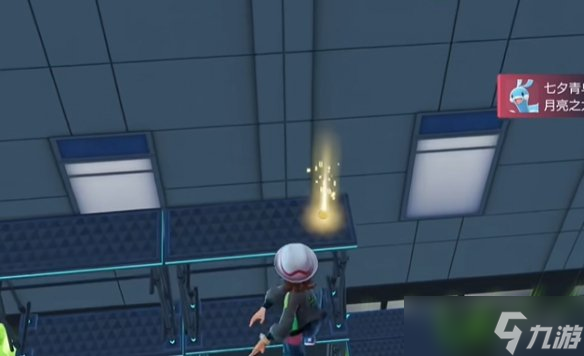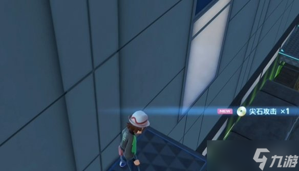 5、上去后在平台边缘调整身位,然后使用滑翔落到闪金光的平台上。将宝可梦球捡起获得尖石攻击招式学习器。