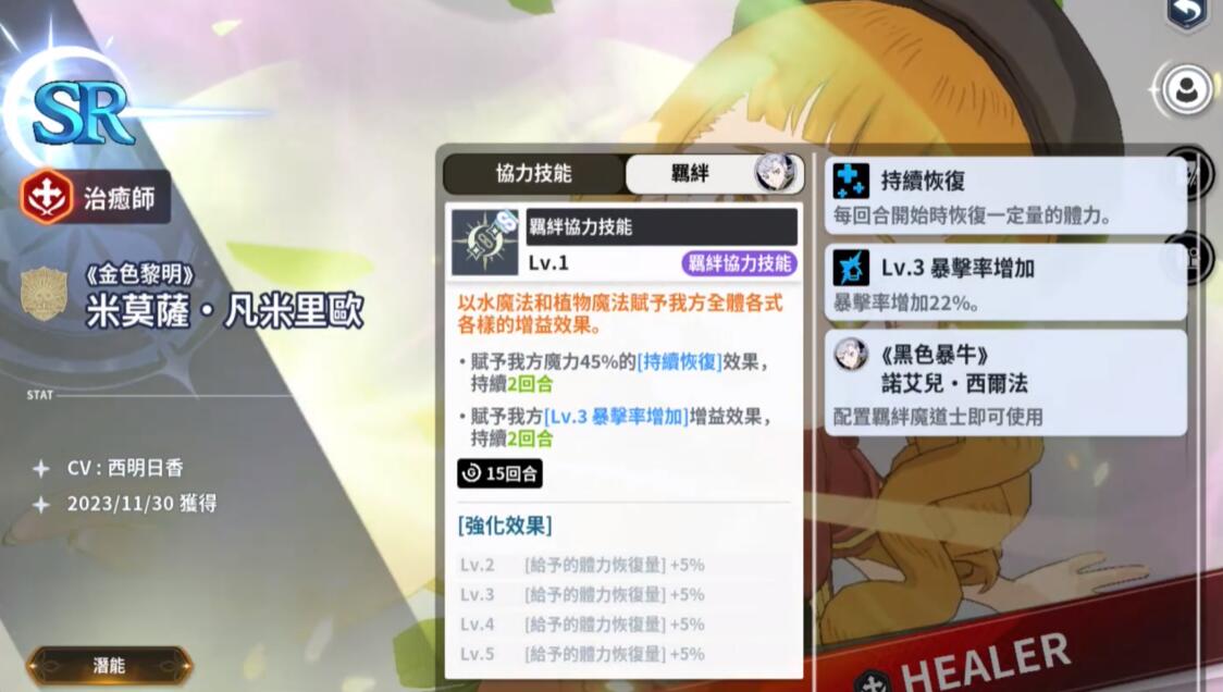 米莫萨属于感知系治疗者,拥有群体与单体治疗技能,并可在特定条件下施展复活技能,使阵亡队友重返战场。凭借出色的支援能力,他在挑战高难度副本或PVP对战中都显得至关重要,是许多玩家组建核心阵容时不可或缺的选择。
