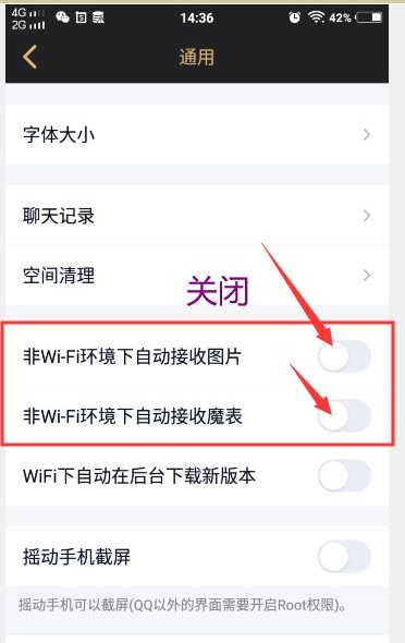 3、在通用选项中关闭自动接收图片和自动接收魔表功能