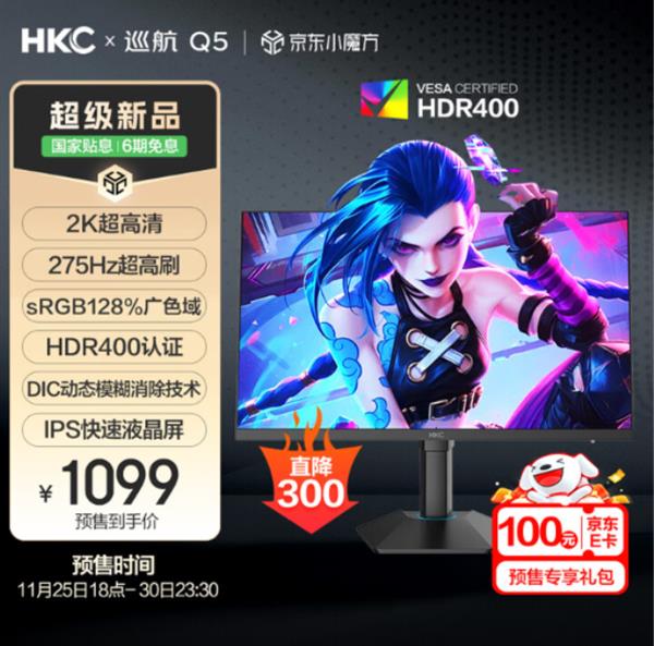HKC巡航Q5的出现,以24.5英寸的紧凑尺寸解决了空间痛点,以2K+275Hz的旗舰配置满足了玩家对流畅、清晰的核心需求,还加入了HDR 400、DIC动态模糊消除、95% DCI-P3色域等配置,更以999元的价格拉低了超高刷电竞小钢炮的门槛。对于追求 “小而精” 的电竞玩家而言,这款集 “高清、高刷、多场景适配” 于一身的显示器,无疑是近期装机、升级设备的优先选择。