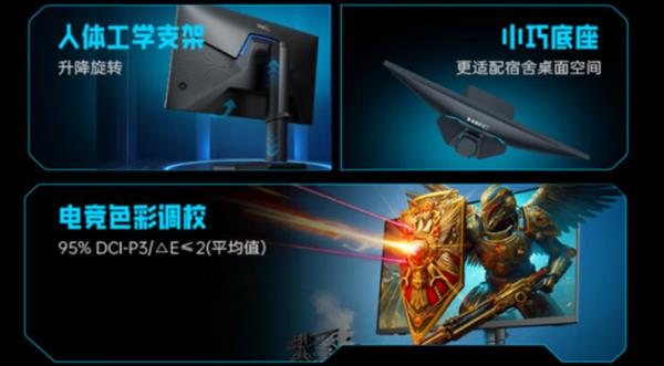 从产品发布的商详不难看出,巡航Q5的核心定位是 “小桌面专属高刷利器”。其采用的 24.5英寸屏幕,恰好契合电竞场景的 “黄金视距”:玩家无需频繁转动头部即可覆盖全画面,操作专注度与跟手性大幅提升;搭配小巧底座,占地面积小,即便是宿舍书桌,也能留出足够的键鼠操作区域,彻底解决 “大屏占地方” 的痛点。