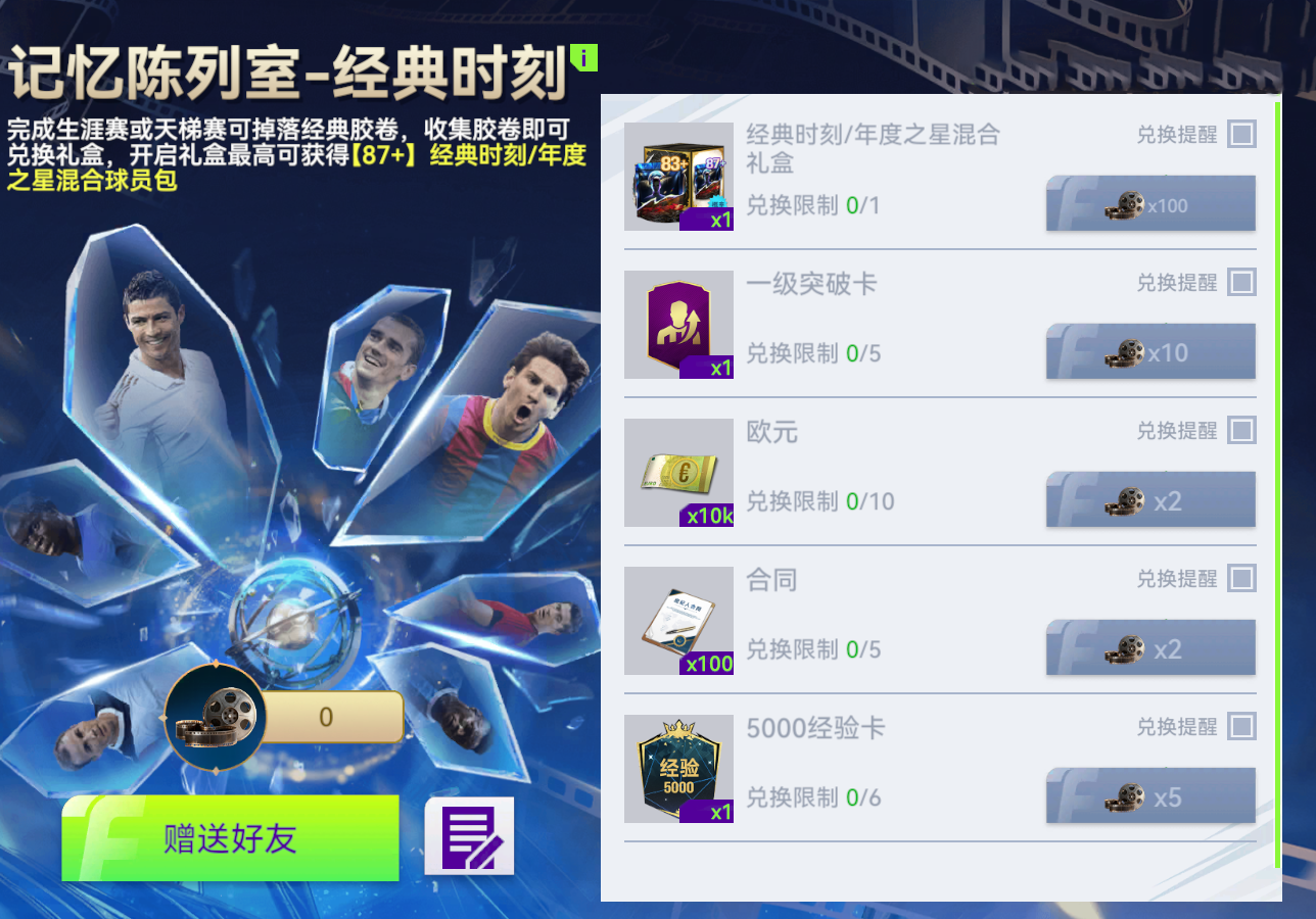 完成生涯赛或天梯赛可掉落经典时刻徽章,收集徽章即可兑换球员礼盒,最高可获得【87+】经典时刻混合球员包。昨夜的世预赛已经写入足球记忆册,而每届大赛都有让人刻骨铭心的经典瞬间。是2006年意大利夺冠的狂喜,还是C罗在欧洲杯上的封神时刻?这些记忆如今都能在《最佳球会》中找到传承。