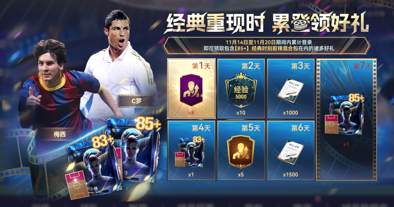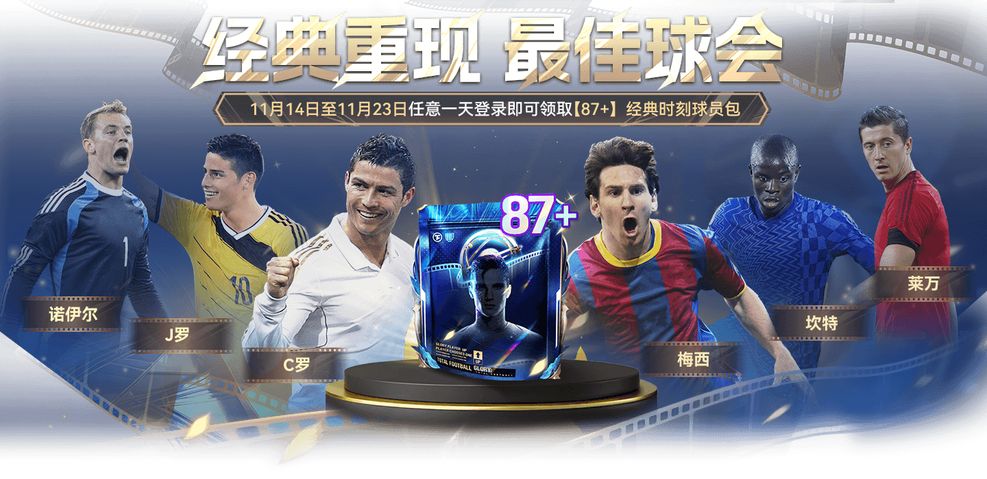 活动期间累计登录,即可获得包含【85+】经典时刻前锋混合包在内的诸多好礼。11月14日至11月23日任意一天登录即可领取【87+】经典时刻球员包。每一张 “经典时刻” 球星卡,都是一段足球记忆的缩影。当你操控梅西重现单骑闯关,用莱万复刻 9 分钟 5 球,赛场不再只是竞技的舞台,更是致敬传奇的殿堂!