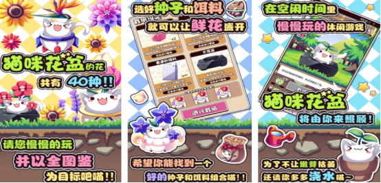 卡通的风格,让很多玩家在选择时觉得赏心悦目。当花盆以及猫咪相互碰撞时,可通过培育花盆的方式收获不同品种的猫咪或者是各种花卉类型,起初大家拥有的种子类型特别简单,通过精心培育,按时浇水的方式让这些花朵茁壮成长,还可一瞬间收获40多种不同的花卉类型。