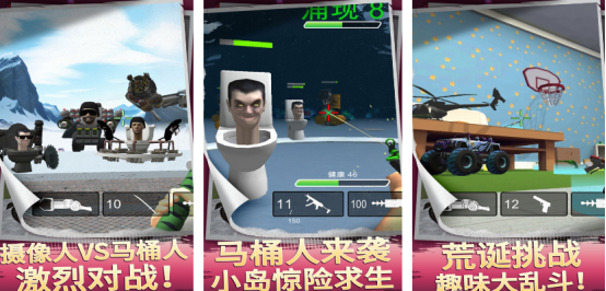 以沙盒求生为主要核心,在特别恐怖的海岛环境当中,这里的环境特别糟糕,尤其是在寒冷的冬天时会面临着冰天雪地的样子,随时随地都会威胁到自己的生命,因此大家在小岛上就需努力收集各种线索,还要勇敢的和马桶人展开疯狂较量,其中的武器类型也应有尽有,大家可从下方不断挑选自己喜欢的武器类型展开趣味性十足的大乱斗模式。